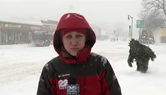 The entire Northeast got pounded by a blizzard yesterday with some areas reportedly getting over 12 inches of snow. One of the cities rode hard and put away wet by Winter Storm Niko was Springfield, Massachusetts where WWLP meteorologist Jennifer Pagliei was video bombed by a ‘Pot Sasquatch’.