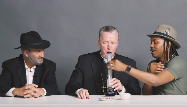 “Oh this is gonna be funnnnnn” the atheist says, as the priest rips a comically thick bong hit after saying he has a very low tolerance for marijuana. The rabbi then grabs the bong like a seasoned pro, but the quiet rabbi is somewhat hesitant to clear the bong entirely.