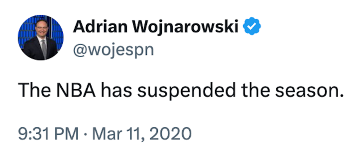 However, it became pretty clear it was serious business when the NBA announced its decision to suspend the season before every other major sports organization followed suit, and Wojnarowski was the first person to share the news.