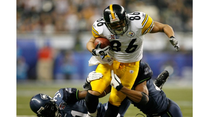 That picture says it all. Holmes had a huge game, catching 9 passes for 131 yards. But, it’s that touchdown with less than a minute left that won the Super Bowl for the Steelers and became one of the NFL’s most iconic plays.