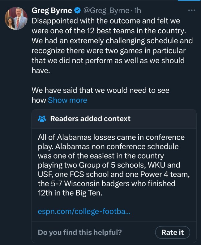 Greg Byrne took offense to that line of thinking. He doesn’t think you should be rewarded for playing a less challenging schedule. He sent a scathing message on social media after the fact blasting the committee.