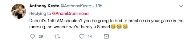 A frustrated Pistons fans wasn’t impressed with his team failing to clinch a playoff spot earlier and clinging to playoff hopes, and decided to trigger Drummond into a Twitter disagreement.