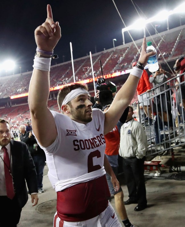 In case you missed it somehow, after dismantling Ohio State 31 to 16 in Columbus, Oklahoma Sooners quarterback Baker Mayfield proceeded to rub salt in Buckeye Nation’s wounds by running on to the field and planting an OU flag right on top of the Ohio State logo in the middle of the stadium.