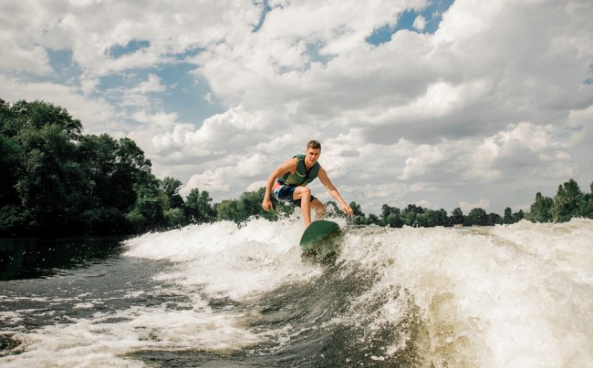 I like to think this idea was dreamed up after several games of beer pong, which would make this stunt even more amazing if Chell had indeed caught a buzz before catching a wake. As someone who has never even been able to stand up on a wakeboard, I have no idea how he pulled this off, but props to him for not losing an eye by wiping out and hitting a table leg.