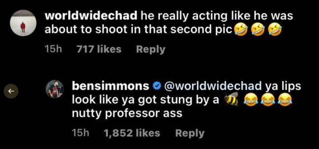 This means that Ben read the comment, clicked into worldwidechad’s profile, found a demeaning physical quality and clapped back in a sea of positive comments.