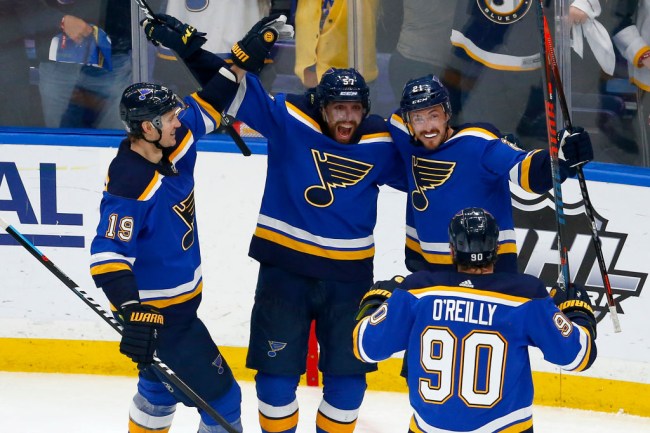 Case in point: in Game One of the series, Torey Krug of the Bruins and David Perron of the Blues got into it down in front of the Bruins’ goal. And by “got into it,” I mean Perron basically tried to choke Krug with his stick as he took him to the ice then lorded over him like an asshole older brother.