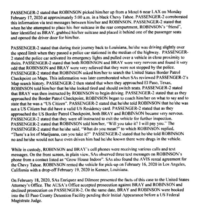 Robinson — who was also with 26-year-old ex-NFL player Quan Bray — was stopped around 7:15 PM on Monday evening after a Border Patrol drug-sniffing dog alerted to the rear cargo door of their 2020 Chevy Tahoe.According to the docs, Robinson and Bray were NOT reentering the country from Mexico — rather they were trying to get from Los Angeles to Louisiana and hit the checkpoint on the way.