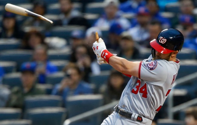 Last night, Harper showed off more of his superhuman powers during his first plate appearance during a matchup against the Mets. He put the Nationals on the board with his seventh home run of the season on a broken bat swing that sent the ball flying 406 feet into the stands.