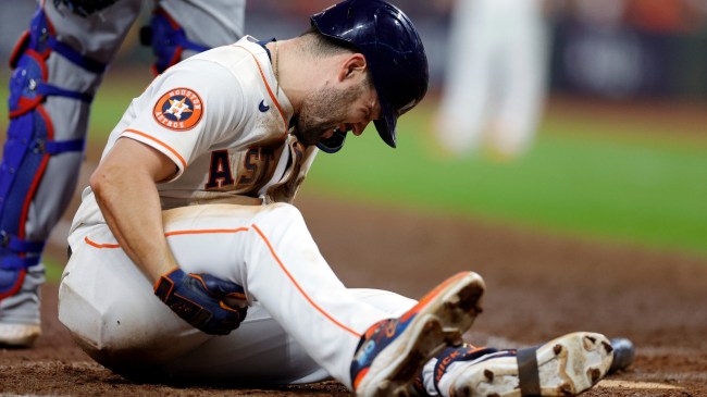 Houston slugger Chas McCormick was plunked by a 104 MPH fastball in Game 7 of the ALCS. The scene looked painful as he fell to the ground, grimacing in the batter’s box.