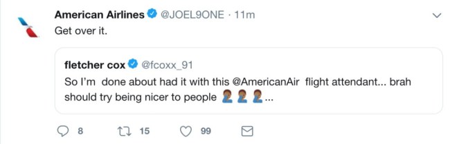 Not only did Cox reply to Chris Long, but, so too did American, giving some typical BS response about how the crew on flights should be polite and blah, blah blah. Take a look below.