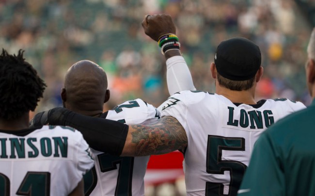 Now, however, Long is putting action into his words as on Thursday night during the national anthem when teammate Malcolm Jenkins displayed a protest to racial inequality in America Long became the first white player to actually display a public show of support by putting his arm around Jenkins.