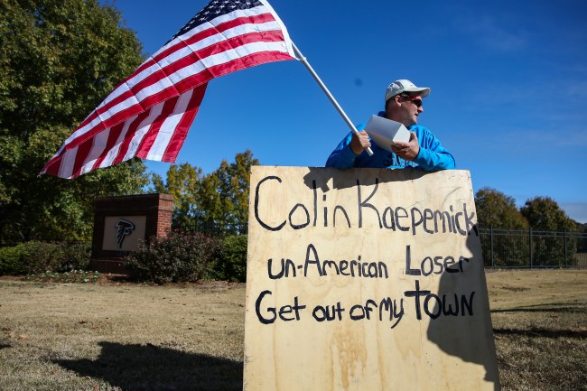 Of course, people who are not fans of Kaepernick’s protesting of the anthem showed outside the Falcons’ practice facility to make their voices heard.