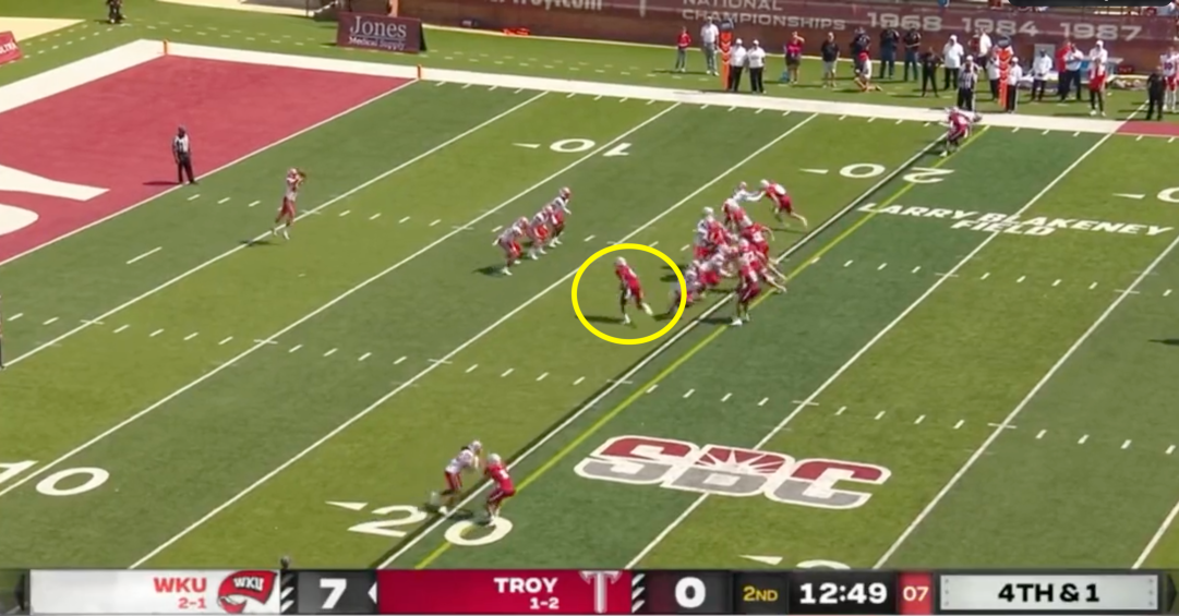 It was very clear that he stood no chance of getting the kick off as soon as the ball was snapped. Western Kentucky’s protection collapsed and the Trojans had a player running free, full-speed off of the edge toward the punter.