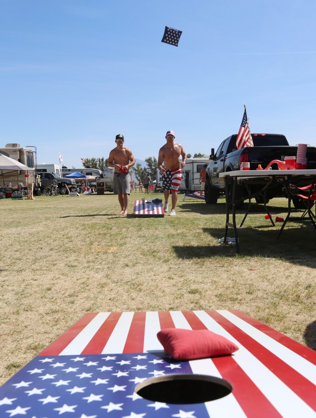 INDIO, CA - APRIL 28: Festivalgoers are seen playing cornhole in the RV Resort during day 1 of 2017 Stagecoach California's Country Music Festival at the Empire Polo Club on April 28, 2017 in Indio, California. (Photo by David McNew/Getty Images for Stagecoach)