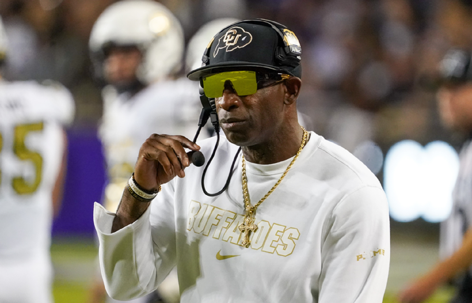I thought I was imagining things but Deion is out here coaching with one shoe 😭 pic.twitter.com/AcnsXofQLA