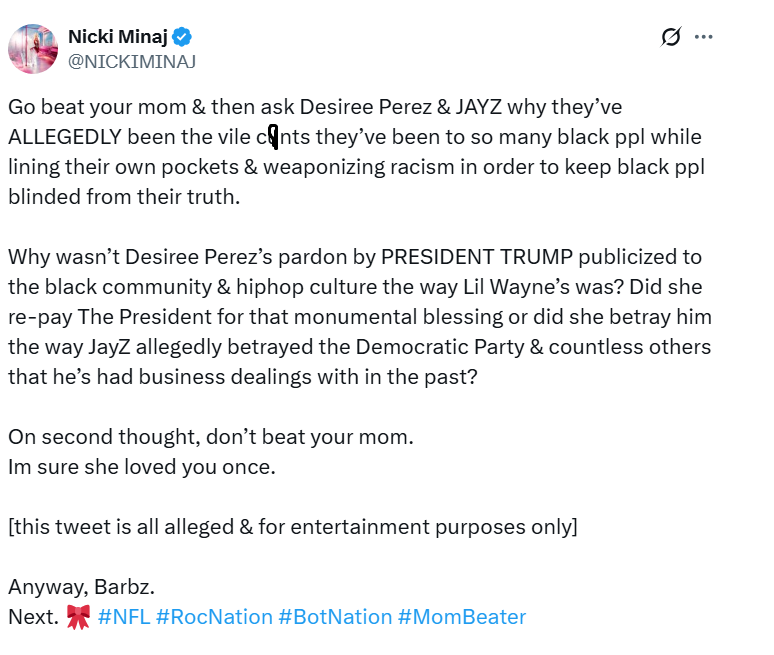 Every time you do a “Jerry Jones” or “NFL” story time, I’ll do a “story time” of my own. https://t.co/krBUoT3PO0 pic.twitter.com/wgZZcgZ6eg— Nicki Minaj (@NICKIMINAJ) August 4, 2025
