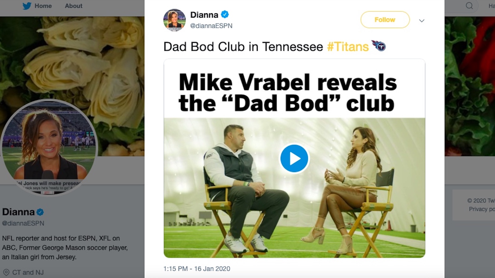 A 2020 interview in which Dianna Russini asked then-Titans head coach Mike Vrabel about his “dad bod” has been unearthed