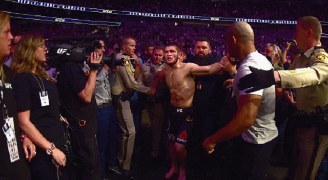 After his win tonight at UFC 229, Khabib Nurmagedov jumped out of the Octagon to fight one of Conor McGregor’s teammate, Dillon Danis, who was talking trash to him.
