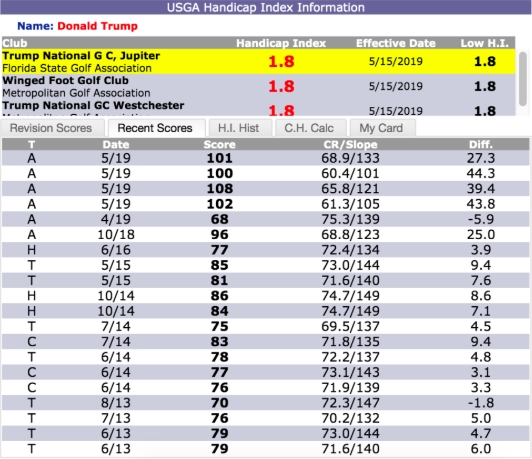 According to GolfWeek, “Four scores were posted to Trump’s USGA-administered GHIN handicap system on Friday, a day on which the president returned from New York to Washington and did not actually play golf.”