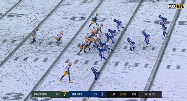 It’s snowing hard at Met Life stadium this afternoon and Fox decided to display some digital yardlines and hashmarks during today’s Packers-Giants broadcast to help fans keep track of things on the field.