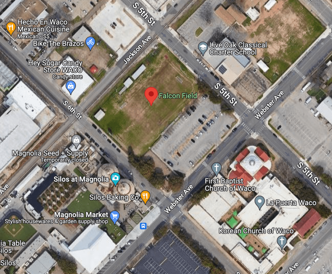 Live Oak plays six-man football at Falcon Field, which backs right up to South 5th and South 6th streets. There are no nets on either field goal, which makes for an interesting scene when either team goes to kick.
