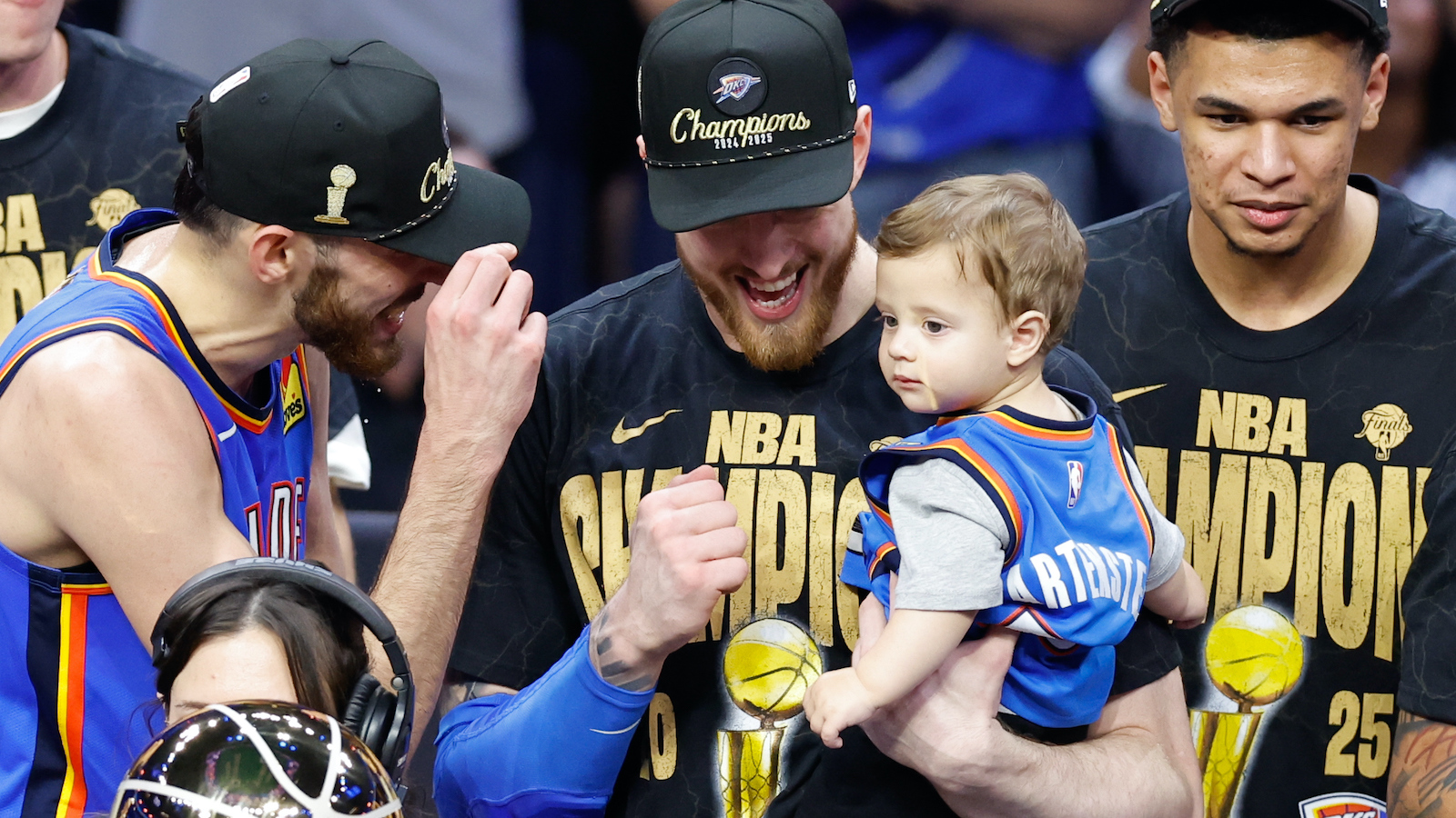 Oklahoma City Thunder center Isaiah Hartenstein went viral on Sunday night for not properly supporting the floppy head of his sleepy young son while celebrating OKC’s 2025 NBA title win.