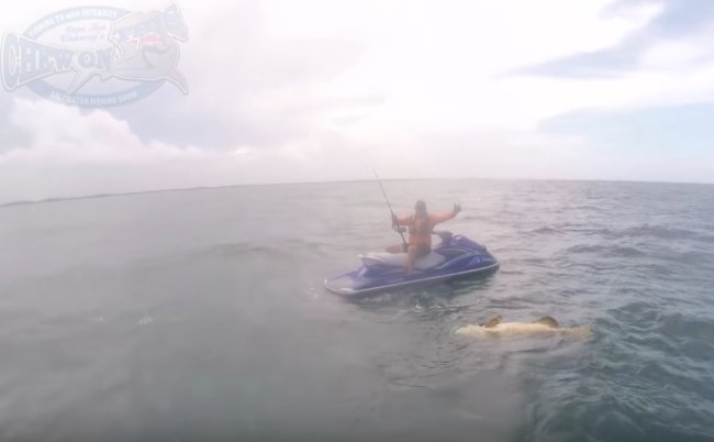 Fishing from a Jet Ski in rough seas off the coast of Florida makes this a total beast of a different nature. You’re contending with the massive fish pulling your Jet Ski around while trying to maintain balance. You don’t want to the rod to pull you over and tip the Jet Ski, and you have to be mindful of the waves that are constantly rolling through and tipping your Jet Ski. It’s a total clusterfuck, but Captain Ben of Chew on This managed to reel in this massive Goliath Grouper:
