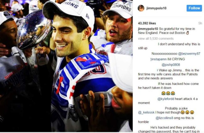 Anyway, let’s get back on track. Jimmy Garopollo allegedly posted an Instagram at 4 am this morning of an image from Super Bowl LI post-game victory celebrations, with the caption “So grateful for my time in New England. Peace out Boston.” Sources claim that there are no indications that Jimmy has been traded, thus leading us all to believe that Jimmy has actually been hacked.