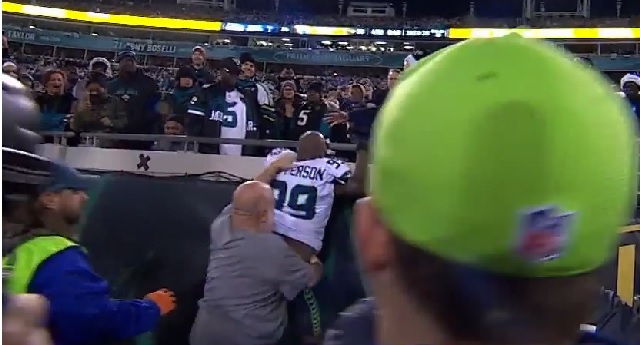After being ejected in the final minutes of last night Jaguars-Seahawks game, Quinton Jefferson was making his way to the tunnel to get into the locker room when a fan threw a drink at him. Jefferson went to confront the fan and all hell broke loose.