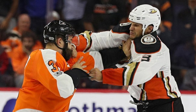 Ducks defenseman Kevin Bieksa dropping opponents with Superman punches is starting to get ridiculous. It was just a month ago that Bieksa put Flyers defenseman Radko Gudas down hard with a Superman punch (that’s him connecting solidly with Gudas’ grill above), and now he’s done it again.