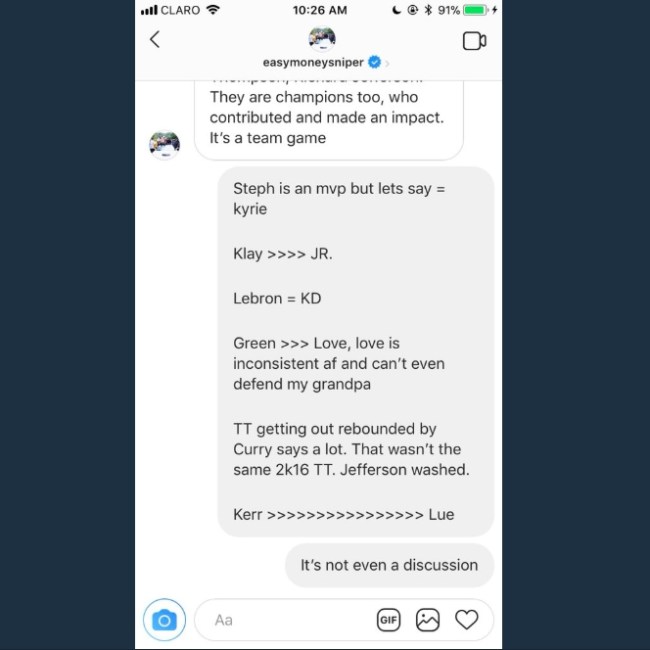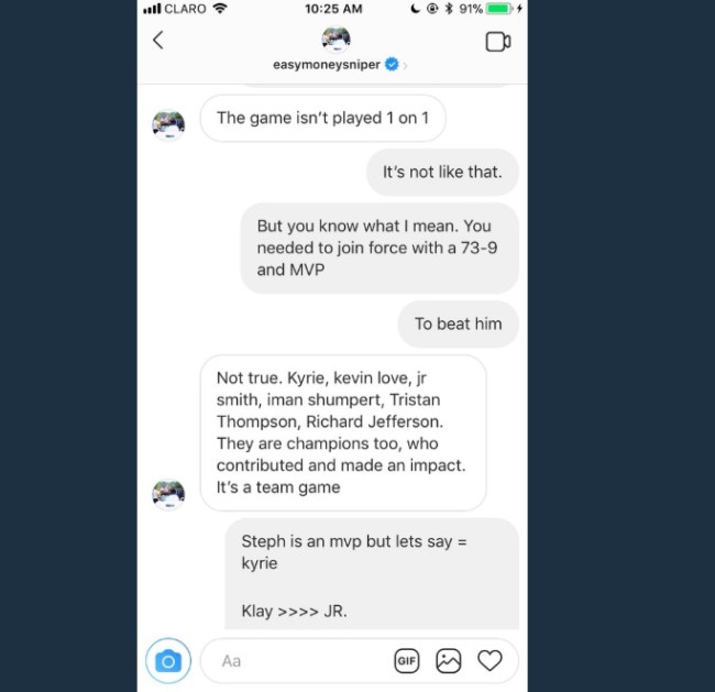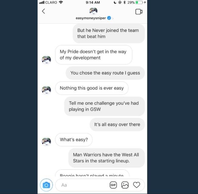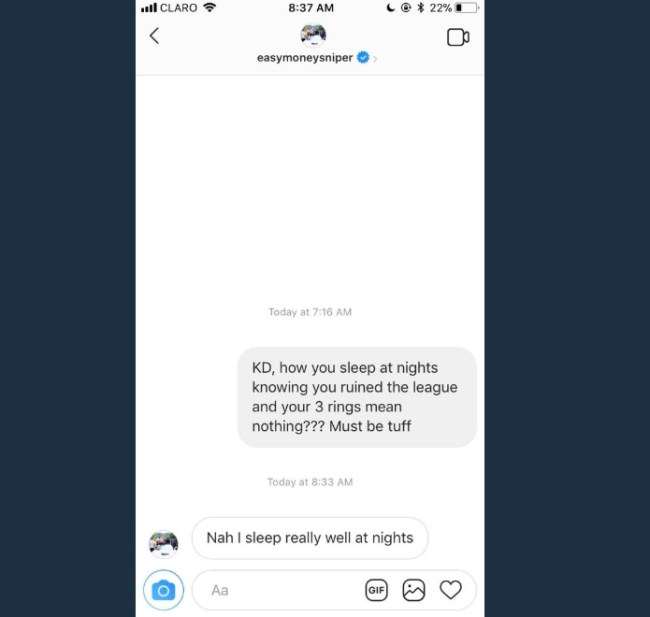 An Instagram user posted his in-depth conversation with Durant in a series of tweets Tuesday after starting the conversation with: “KD, how do you sleep at nights knowing you ruined the league and your three rings mean nothing??? Must be tuff.”