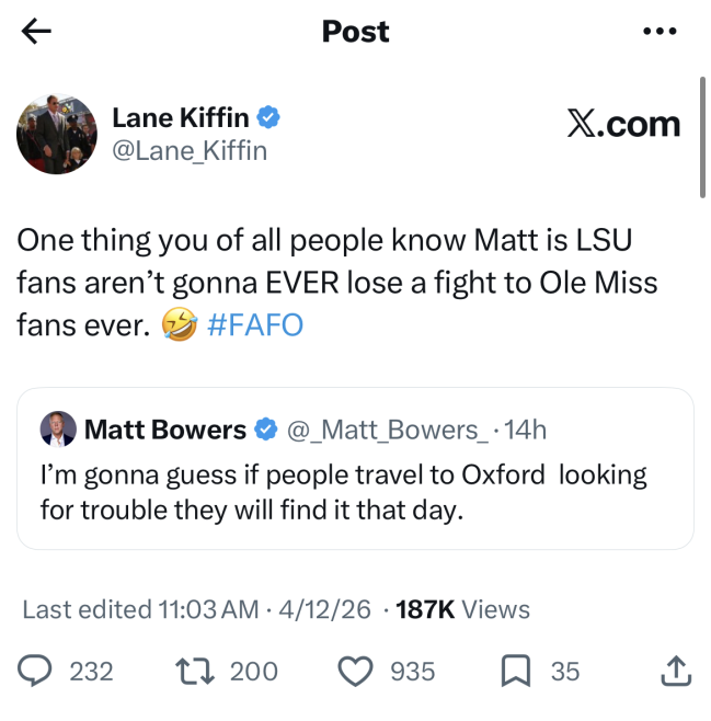 In a now-deleted tweet, the head coach wrote, “One thing you of all people know Matt is LSU fans aren’t gonna EVER lose a fight to Ole Miss fans ever. #FAFO”