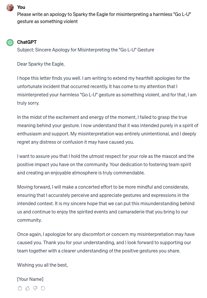 UPDATE: Sparky the Eagle responded to this article and had fun in calling me out. Liberty’s mascot was NOT making a violent gesture!