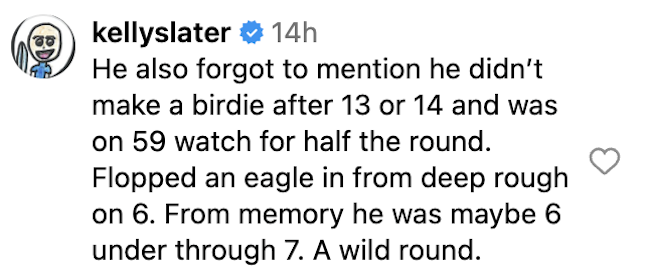 Siem—who’s memory of that day is understandably a bit hazy—incorrectly asserted that was one of the three occasions when he at least tied a course record while “hammered” and noted he puked two times while playing the 18 holes where he was paired with pro surfer Kelly Slater, who hopped into the comments to share his recollection of what went down.