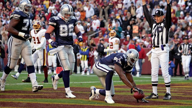 This is my favorite TD celebration of all time because of the preparation involved. Yes, Owens had to go out of his way to stash a Sharpie in his sock, but Horn took the time and effort to covertly plant a phone in the end zone (it’s safe to assume he actually hid them under both goalposts) before the game.