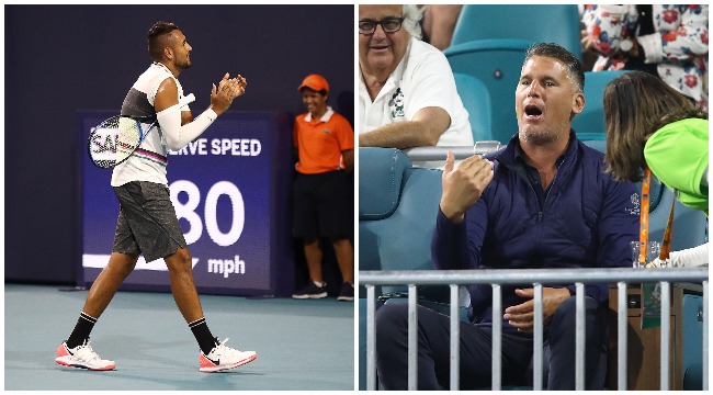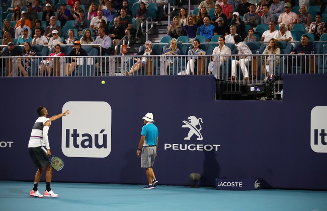 During third-round win against Dusan Lajovic at the Miami Open, Kyrgios engaged in a trash-talking battle with a spectator who was poking at his the entire match.