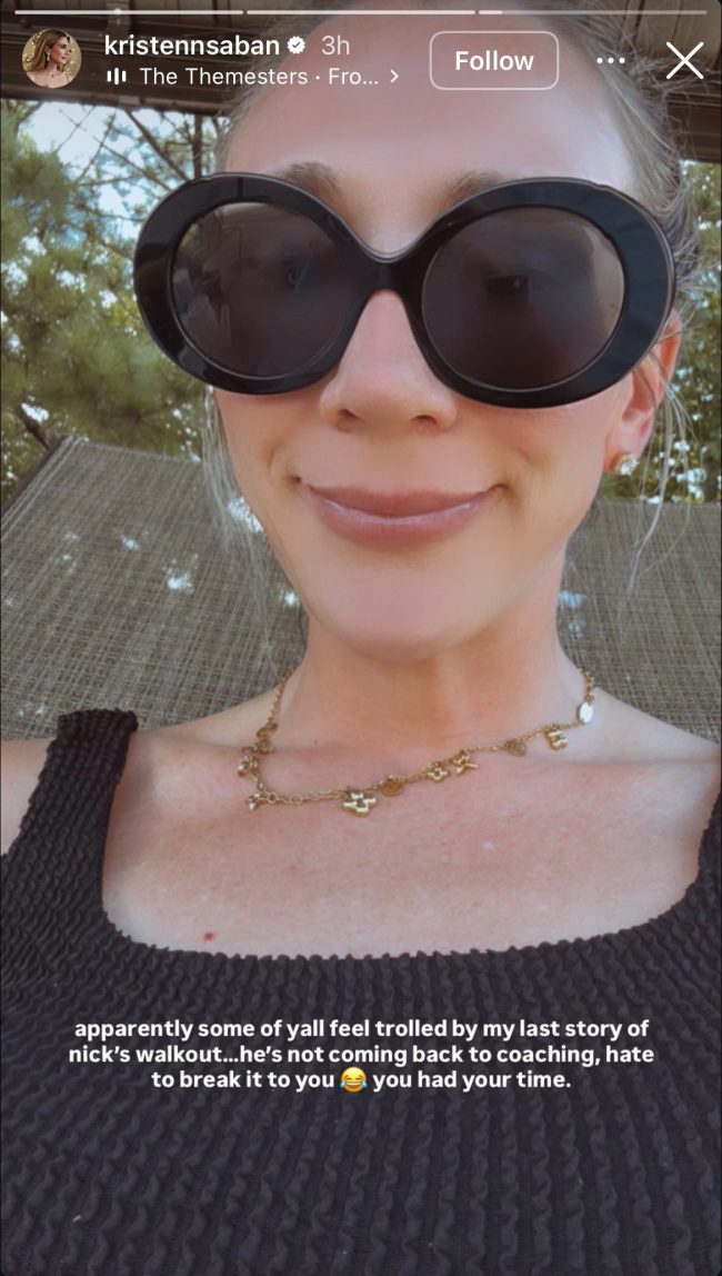 “Apparently, some of y’all feel trolled by my last story of Nick’s walkout… He’s not coming back to coaching, hate to break it to you,” she replied. “You had your time.”
