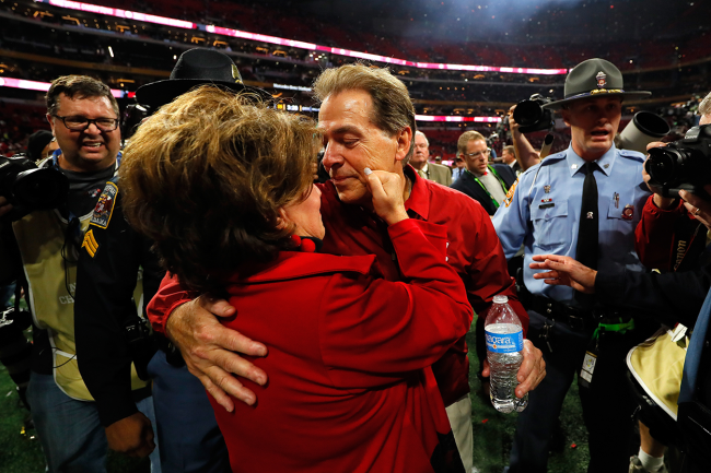 Find someone who celebrates your successes like Nick Saban’s wife Terry. After Saturday’s heart-racing Iron Bowl win, she was the first to greet her husband in the tunnel and could not have been more excited.