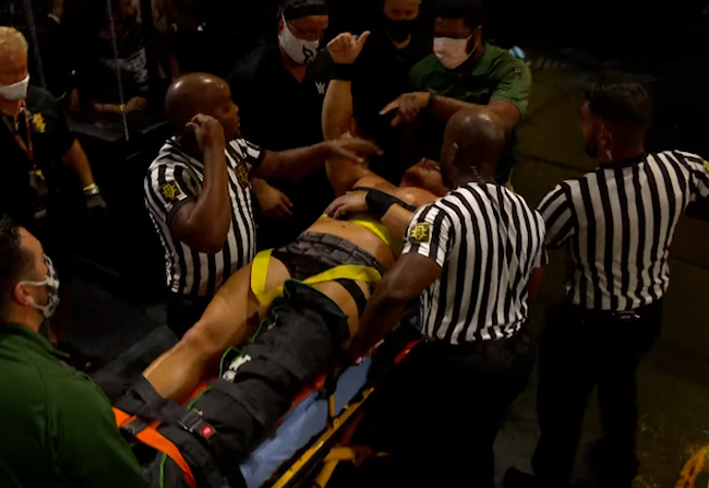His leg folds underneath him as he attempts to base for Oney Lorcan. He's set for a long spell out injured just as he was primed for a big angle.