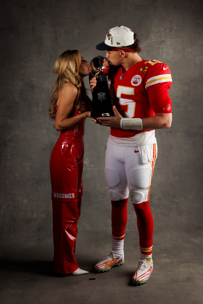 The Super Bowl LVIII MVP posed for a picture with his wife, Brittany, after the game, posing with the Lombardi Trophy.