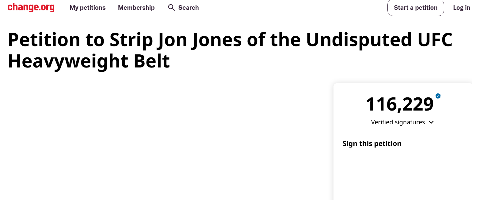A petition on Change.org, asking the UFC to strip Jones of the title, has now reached over 100,000 signatures in less than a week.