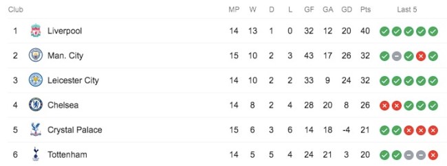Manchester City: Following their difficult draw at Newcastle last weekend that saw Kevin De Bruyne’s Puskas Award contender nullified by Jonjo Shelvey’s equally fantastic strike, City got their act back together on Tuesday by absolutely mopping the floor with Burnley (and then oddly posed for postgame team photos as if they just advanced to the Champions League final — weird group, that City bunch).