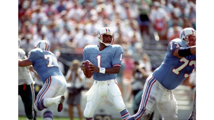 Moon played in one of the first wide-open passing offense in the NFL and took full advantage. He made nine Pro Bowls, is in the Hall of Fame, and retired with the third-most passing yards of all-tim.