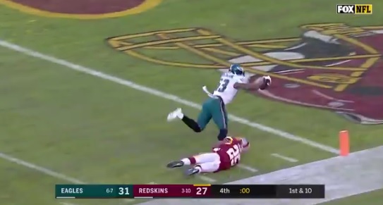 After Chris Thompson stepped out of bounds with :01 seconds in the game, Dwayne Haskins gets sacked and the Eagles defense run back the fumble for the score and cover‼️