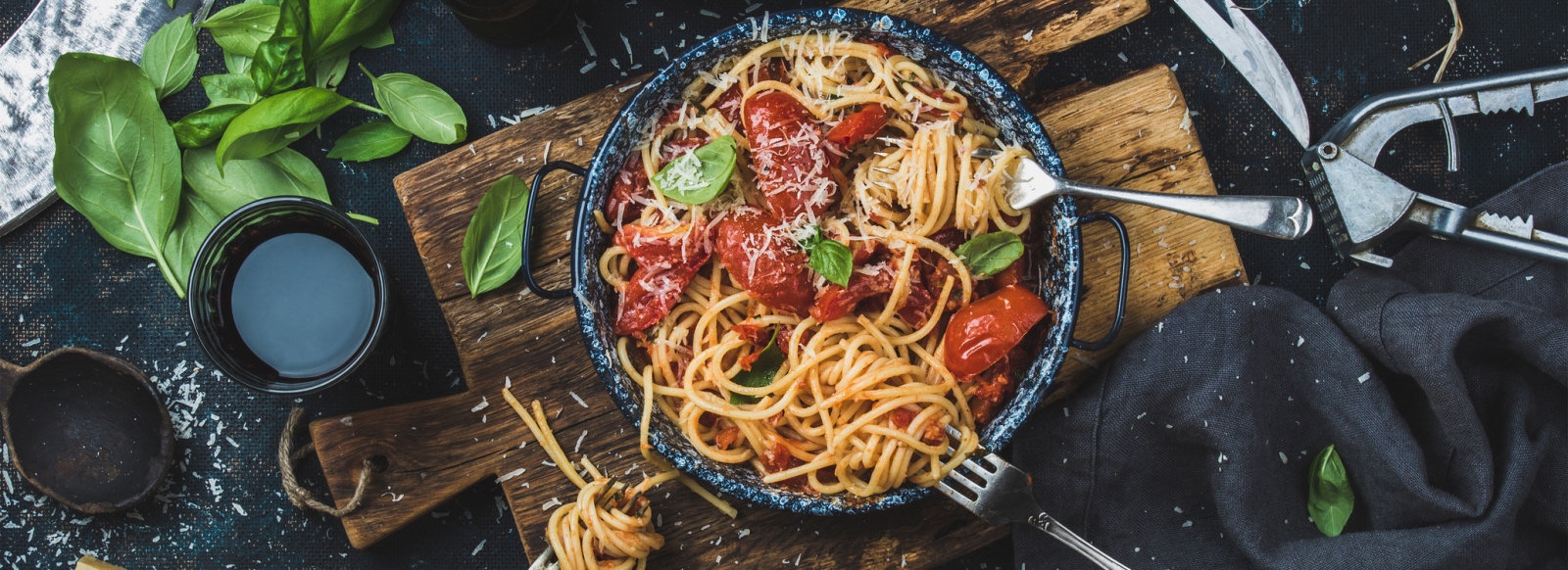 Italian style pasta dinner. Spaghetti with tomato and basil in plate on wooden board and ingredients for cooking pasta over dark blue plywood background, top view