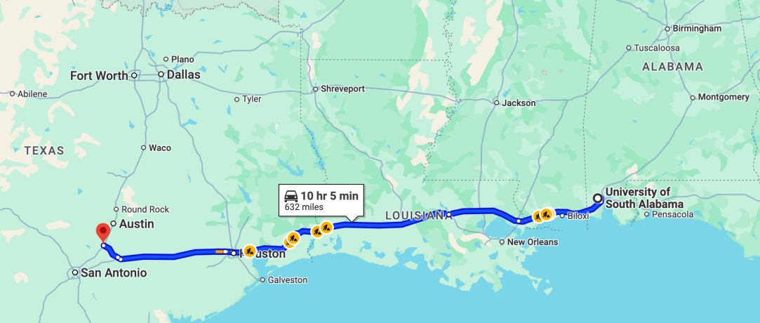 To do so, they will travel west to San Marcos, Texas on Friday to face Texas State on Saturday. It is a 632-mile drive via I-10 West. Google Maps projects the trip will take 10 hours without stopping and doesn’t include the reverse trip home, totaling more than 1,200 miles in more than 20 hours over two days.