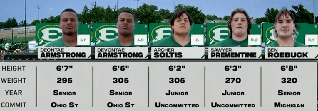 Brothers Deontae and Devontae Armstrong anchor the left side and are committed to Ohio State. Right tackle Ben Roebuck is committed to Michigan. The other two have yet to commit but it is likely that they both will end up at Power Five schools as well.