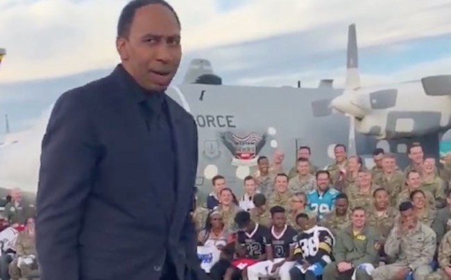 Which is why it should come as no surprise that during First Take‘s admittedly awesome Veteran’s Day Special at the Davis-Monthan Air Force Base in Tucson, Arizona, Stephen A. smith put on his all-black Johnny Cash suit, hammed it up on stage, and looked the military crowd dead in the face to ask how they let the Dallas Cowboys become “America’s Team.”
