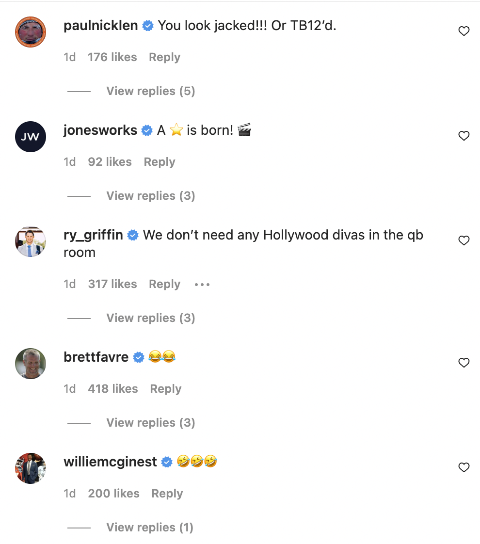Tampa Bay’s backup (4th string?) quarterback Ryan Griffin hopped in Brady’s mentions to say “We don’t need any Hollywood divas in the qb room.” Here are some other comments via screenshot since showing you is easier than me just telling you what people said: