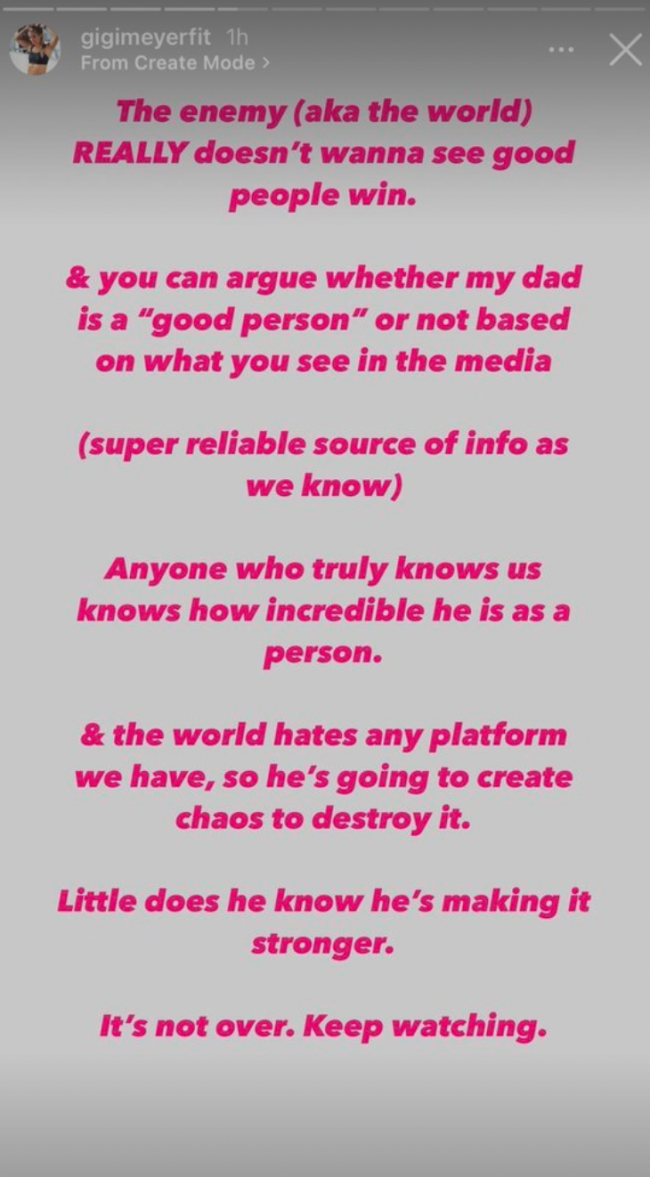 “The enemy (aka the world) really doesn’t wanna see good people win,” she wrote. “And you can argue whether my dad is a ‘good person’ or not based on what you see in the media (super reliable source of info as we know.)”